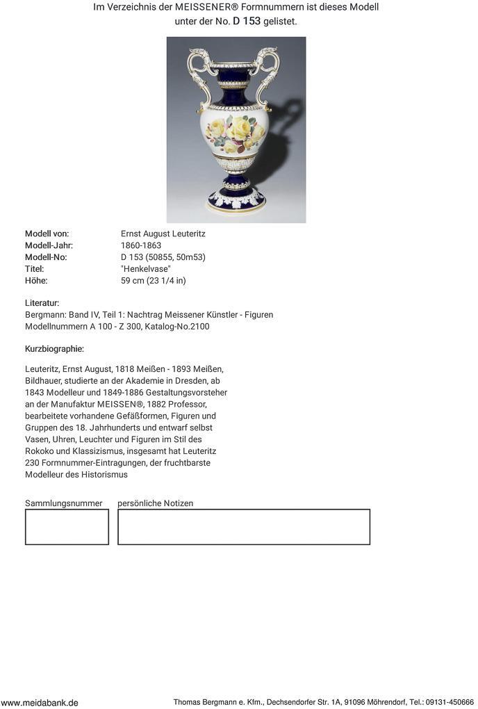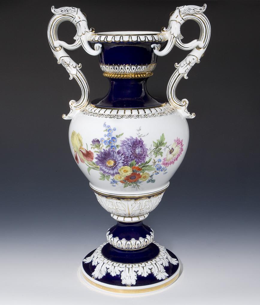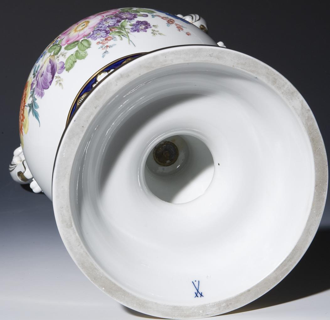 Modell von Ernst August Leuteritz 1860. Floral und ornamental reliefiert, gold staffiert. Partiell kobaltblauer Fond. Beidseits farbige Blumenbemalung mit großen Buketts. Korpus mit hochgezogenen Handhaben über montiertem Standfuß. Ritzmarke, Pressmarke, Schwertermarke mit Punkt.