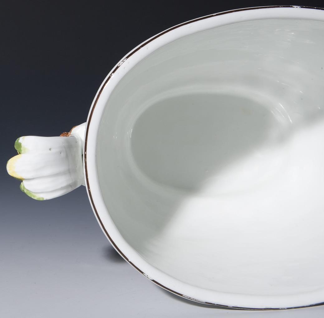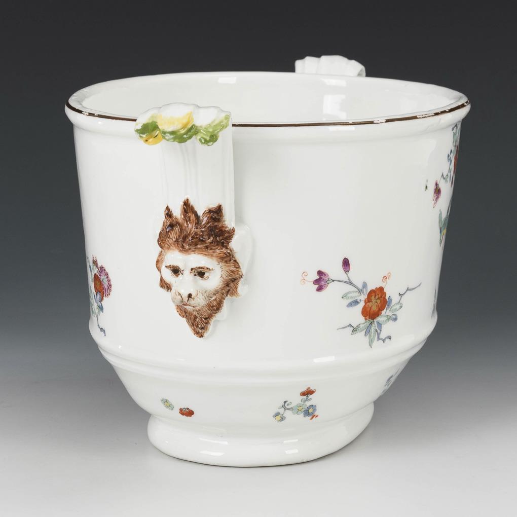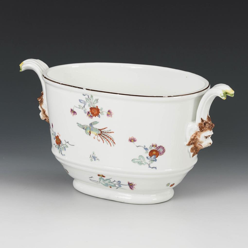 Umlaufend farbige Bemalung in Eisenrot, Emailblau, Seegrün, Purpur, Gelb und Gold. Indianische Blütenzweige mit fliegendem Phönix (Glücksvogel). Ovaler profilierter Korpus. Seitlich reliefierte, naturalistisch bemalte Löwen-Maskarons mit hochstehenden gelb-grün staffierten Schilfblatt-Handhaben. Kapuzinerbraun staffierter Rand. Unglasierter Boden, Pressmarke. Kleine Farbverluste an den Handhaben und am Rand.