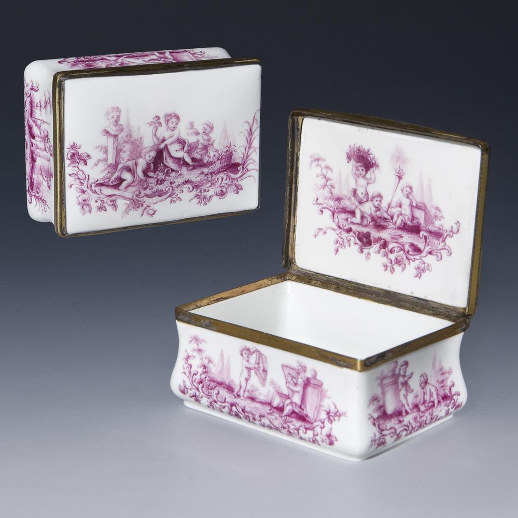 Auf allen Außenflächen und im Deckel sehr feine Purpur-Camaieumalerei mit sieben verschiedenen Szenen "Spielende Amoretten in Landschaft" in der Art von Francois Boucher (1703-1770) über Rocaillen-Konsolen mit Blütenzweigen. Restvergoldete Silber-Montierung mit Scharnier. Ohne Marke. Deckel restauriert.