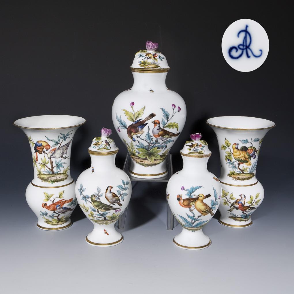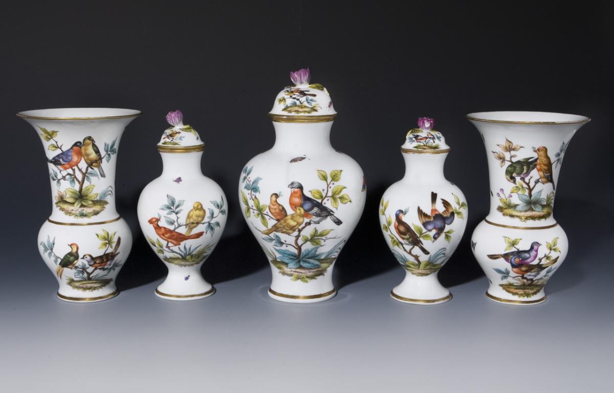 5-teilige Vasen-Garnitur mit Vogelmalerei. Helena Wolfsohn.