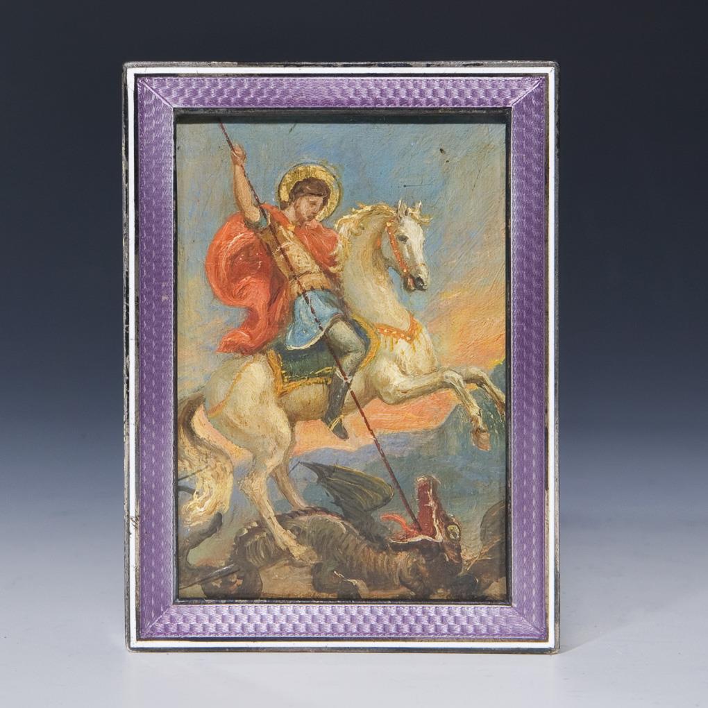 Verglaster Rechteckrahmen. Bordüre mit violettem transluzidem Email und weißem opakem Email. Innen Öl-Miniatur "Der Heilige Georg". Punzen: Feingehalt, undeutliche Rautenmarke.