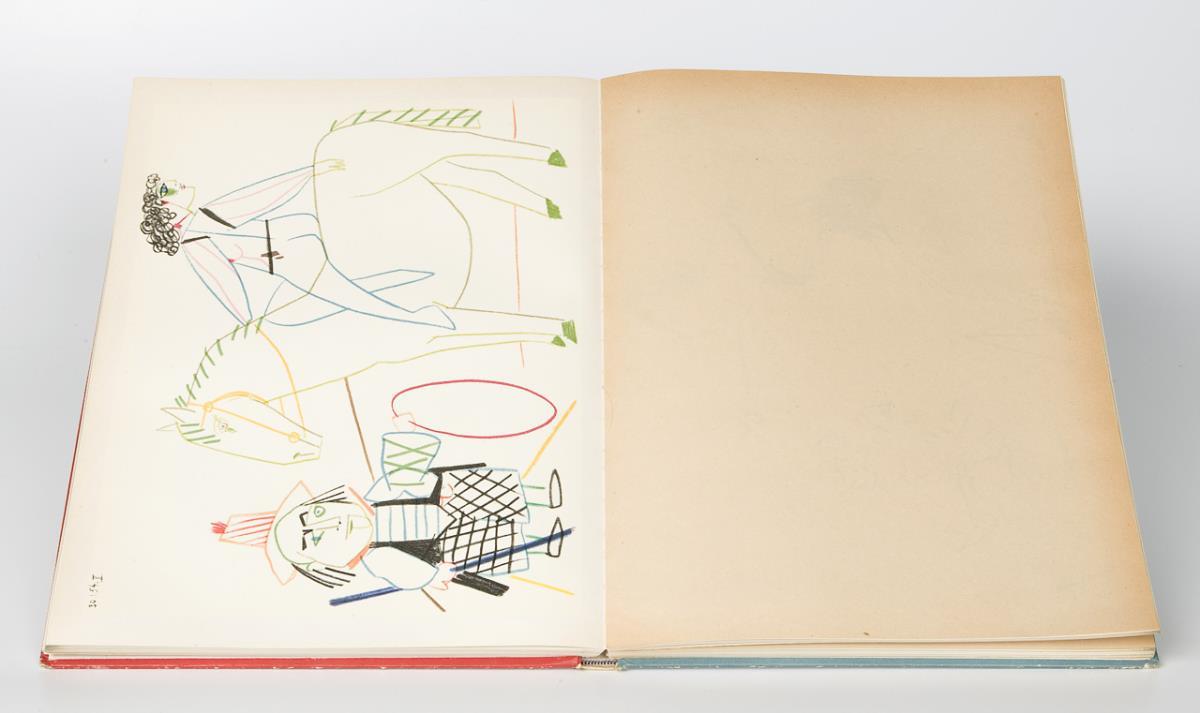 Mit farbig lithographiertem Titel und 12 Farblithographien. 167 Tafeln nach Zeichnungen von Picasso. Druck der Farblithographien bei Mourlot. Editions de la Verve, Paris 1954. Illustrierter Papp-Einband. Rücken defekt.