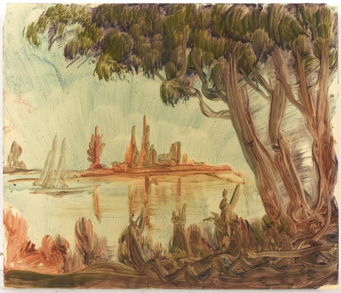 Küstenlandschaft mit Segler nahe dem Ufer. Kleine Fehlstelle an rechter oberer Ecke.