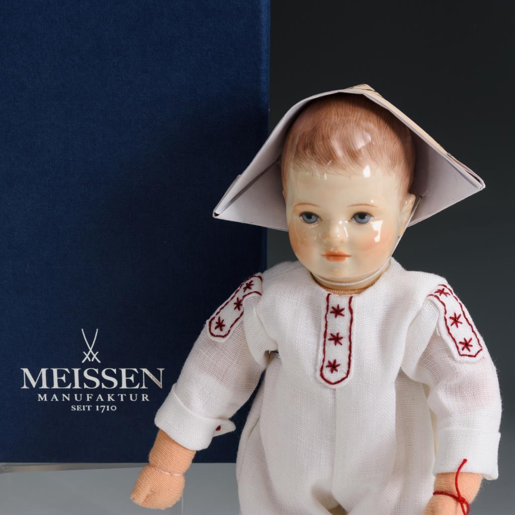 Kind mit Schaukelpferd und Zeitungshut. Inspiriert von der Kinderfigur "Kind, auf einem Holzpferd reitend" des Modelleurs Konrad Hentschel (1872 Cölln – 1907 Meißen). Sonderauflage zum 100jährigen Bestehen der Käthe Kruse Puppenmanufaktur sowie zum 300jährigen Bestehen der Porzellanmanufaktur Meissen.