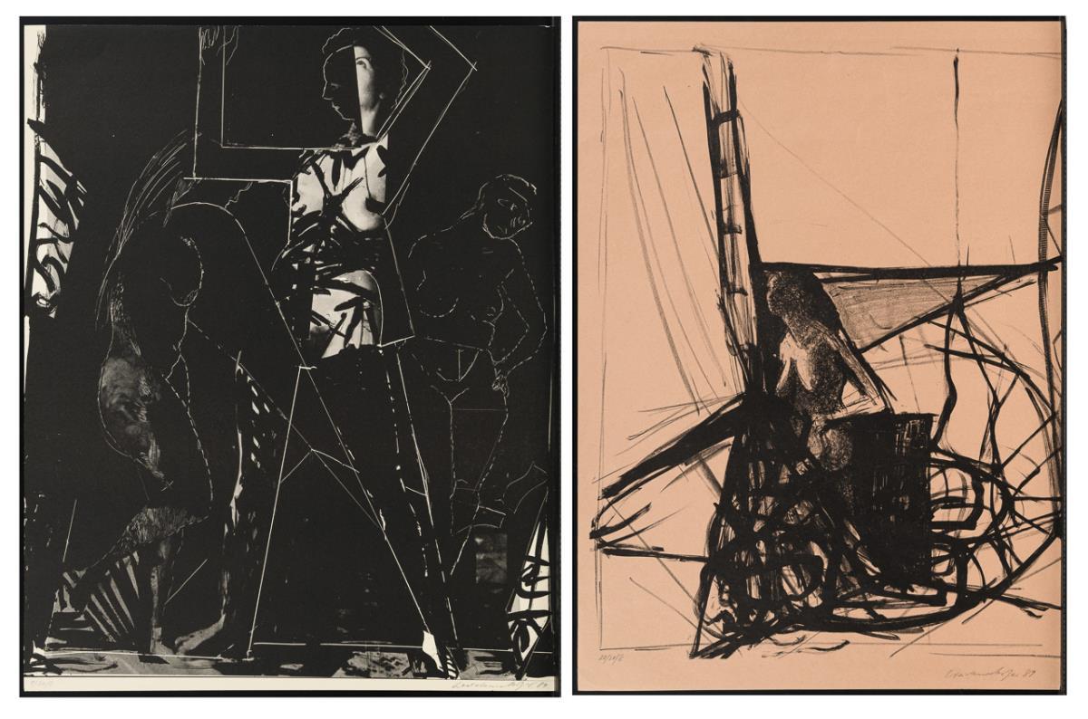 Ohne Titel, Blatt: 60,5 x 48,5 cm, Exemplar: 1/22/II, [19]89 | Ohne Titel, rosafarbenes Blatt: 67 x 48,5 cm, Exemplar: 20/20/II, [19]89, etwas knickspurig.
