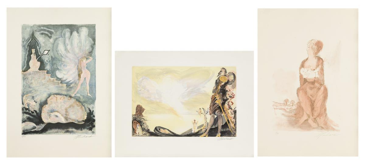 Surrealistische Komposition, Farbradierung, Platte: 32,5 x 48 cm, Blatt: 50,5 x 66 cm, Künstlerexemplar "e.a." | "Wollust", Farblithografie, Blatt: 63 x 43 cm, Exemplar: 7/75 | Surrealistische Komposition, Farblithografie, Blatt: 63 x 43,5 cm, Exemplar: 39/55.
