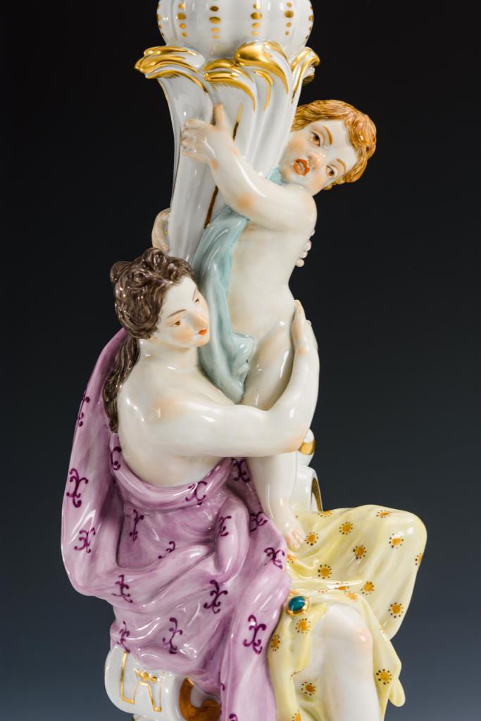 Auf einem Rocaillesockel sitzende Venus, einen Amorknaben mit Kerzentülle tragend.
