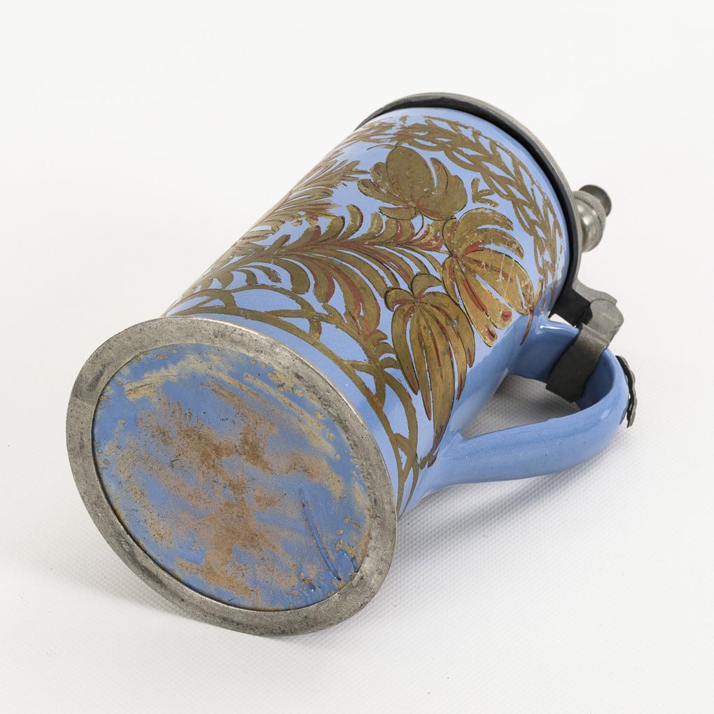 Zylinderform mit Bandhenkel. Auf der Wandung eine große Blume mit Fruchtzweigen. Profilierter Zinndeckel mit Reliefplakette und Kugeldrücker, graviert "IMS", innen gepunzt, Zinnstandring. Glasur- und Dekorbereibungen, Zinnmontierung lose, Lötspuren.