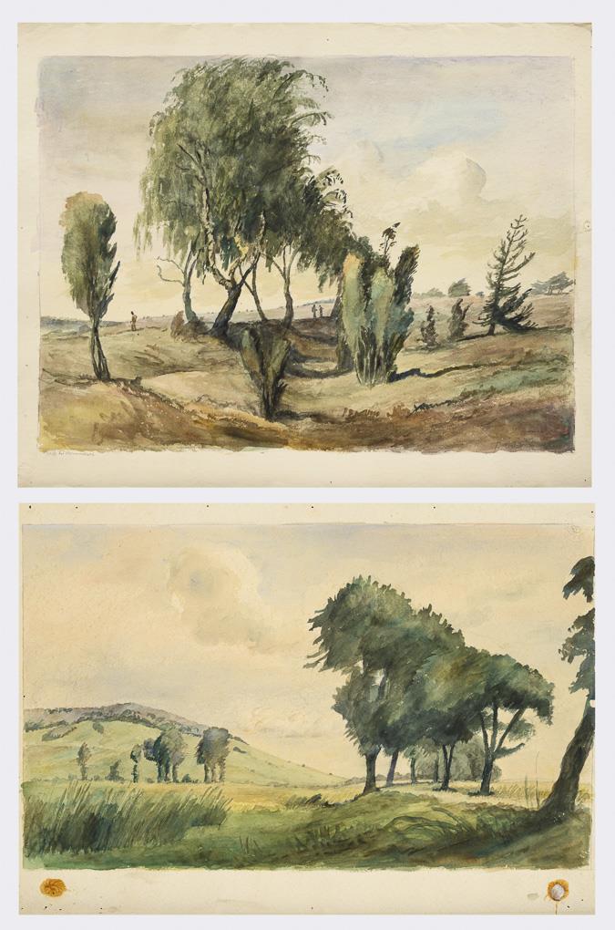 Verschiedenen Landschaften teils mit Staffage unter wolkigem Himmel. Dazu Konvolut an Drucken zu verschiedenen Werken des Malers. Kleine Nadellöcher sowie kleine Knicke und Risse an den Rändern und in den Ecken außerhalb des Bildfeldes.