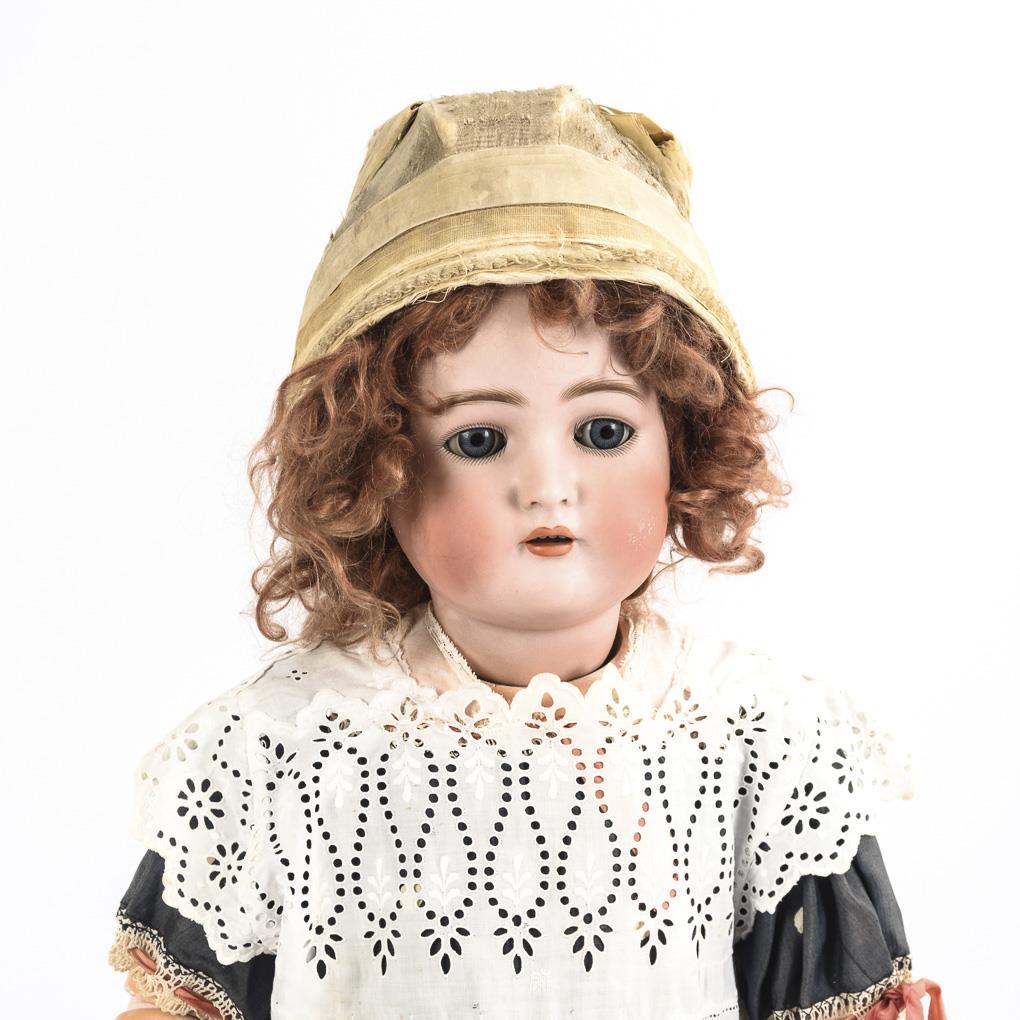 Kurbelkopf, blaue Schlafaugen, Wimpernreste, Ohrringe, Mohairperücke. 13-teiliger Körper mit Laufmechanismus. Weiße Schürze mit Lochstickerei, alte helle Haube, schwarz-weiße Knöpf-Stiefelchen. Kopf durchleuchtet: ohne Defekte, lediglich minimale Brandrisse hinter den Ohren und kleine Chips an den Ohrlöchern. Ergänzte linke Hand aus Celluloid.