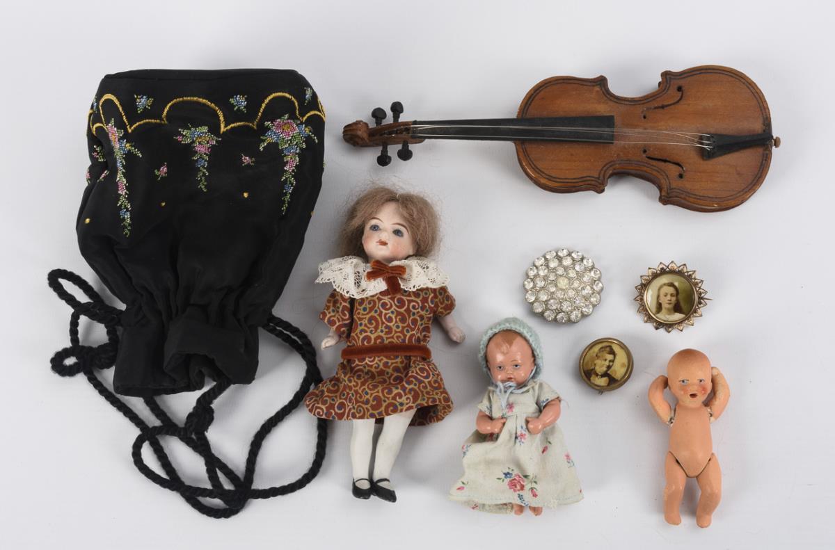 3 Leder- und 2 Stofftaschen, zahlreiche Sträußchen in rosa, hellblau und violett, 6 Paare und 7 einzelne Puppenschuhe. Als Zugabe defekte Holzgeige und 3 Püppchen. Altersspuren und kleine Defekte.