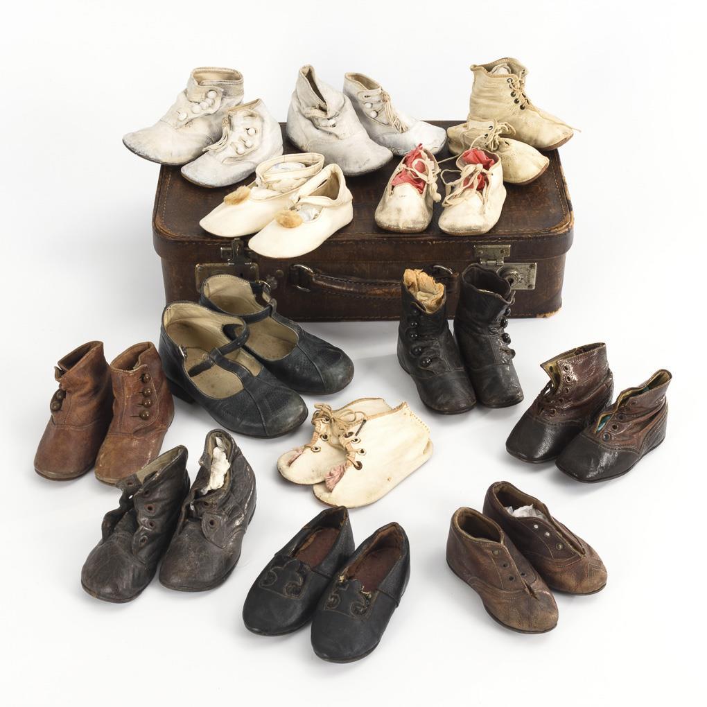 13 Paare alte Kinderschuhe in braunem Köfferchen.