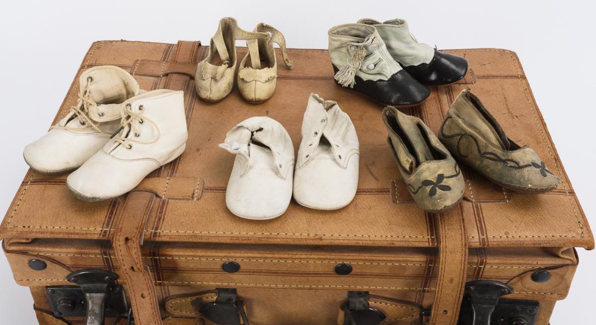 12 Paar alte Kinderschuhe in hellbraunem Lederkoffer.