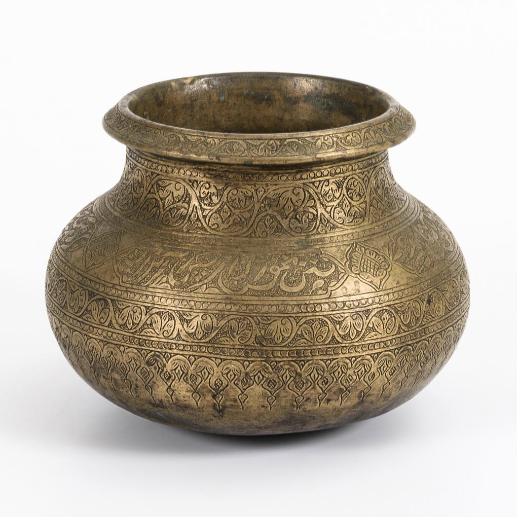 Fein ziselierte Musterkanten und arabische Schriftzeichen. Leicht gerundeter Boden. Schöne Alterspatina.