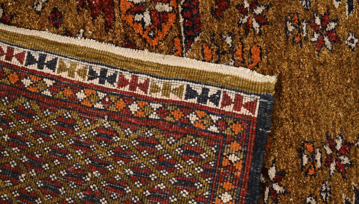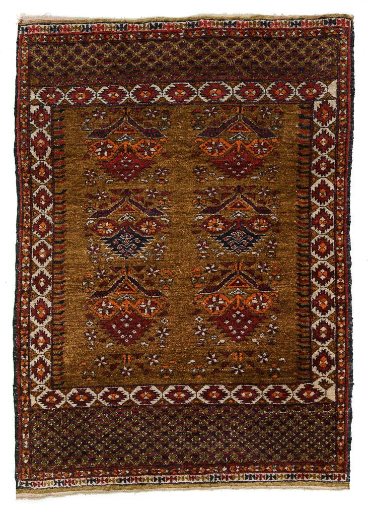 Offenes Mittelfeld mit 6 stilisierten Vasenmotiven, umlaufend eine Reihe Güls, im Endlosrapport gemusterte Paneele an den Schmalseiten. Rahmende schmale Blütenborte, Schmalseiten mit geometrisierter Borte und Kelimabschluss. Minimale Alters- und Gebrauchsspuren.