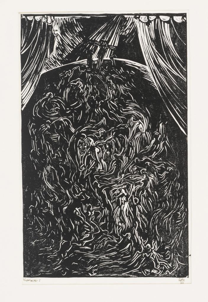 "Welttheater 5", Holzschnitt, Stiftsignatur, Blatt: 36,1 x 25,4 cm, [19]92, oberer Rand mit Klebespuren | "Ecce Homo II", Farbholzschnitt, Stiftsignatur, Blatt: 24,5 x 14 cm, [19]90, beschnitten | Ohne Titel, aquarellierte Lithografie, in der Platte signiert und datiert [19]85, Blatt: 25,5 x 18,2 cm, in den Ecken kleine Löcher durch Wandbefestigung, verso Rand mit Klebespuren | Illustration zu Faust, Lithografie, Blatt: 25,3 x 23,5 cm, in der Platte signiert und datiert [19]81, verso Porträts, in den Ecken kleine Löcher durch Wandbefestigung | "Welttheater", Lichtdruck, Blatt: 32 x 21,3 cm, in der Platte signiert und datiert [19]93, in den Ecken kleine Löcher durch Wandbefestigung, Rand mit Klebespuren | 10 Illustrationen aus Ingo Zimmermanns "Hoffmann in Dresden", 1985 (in 3 Passepartouts montiert) | "Das Kompensationsobjekt", Lithografie, Blatt: 29 x 20 cm, in den Ecken kleine Löcher durch Wandbefestigung, beschnitten.