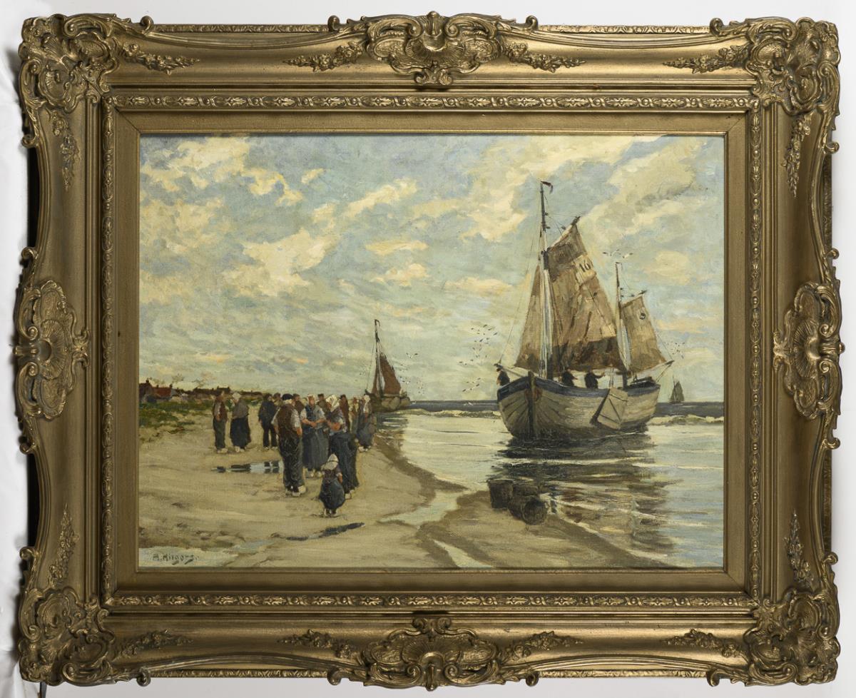 Die Fischer bei den Booten am Strand nahe dem Dorf unter leicht wolkigem Himmel. Minimale Altersspuren.