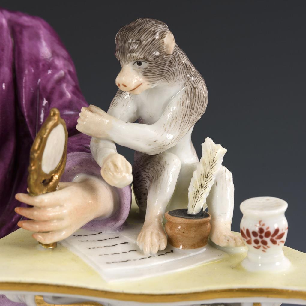 An einem Tisch mit Äffchen sitzender Rokokoherr, einem auf einem Buch stehenden Kind einen Spiegel vorhaltend.