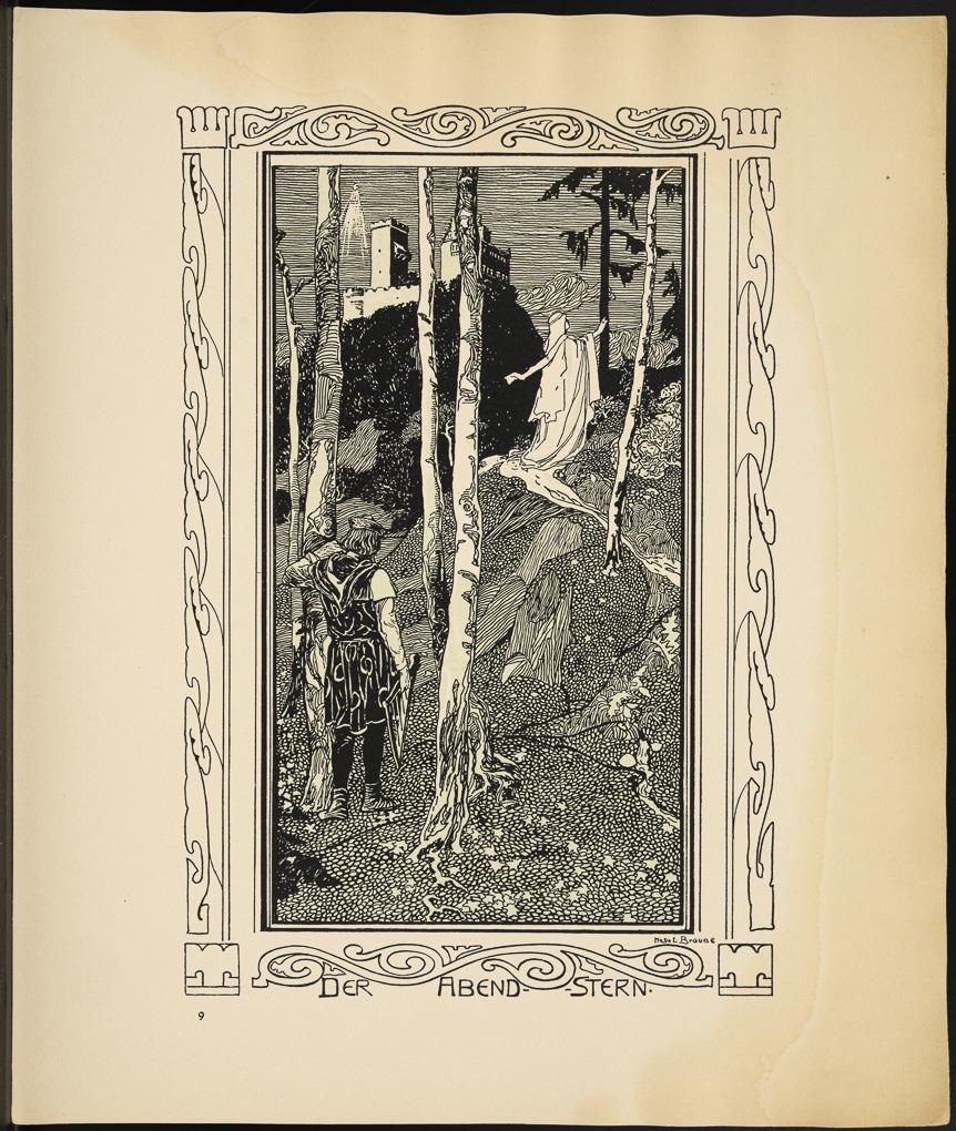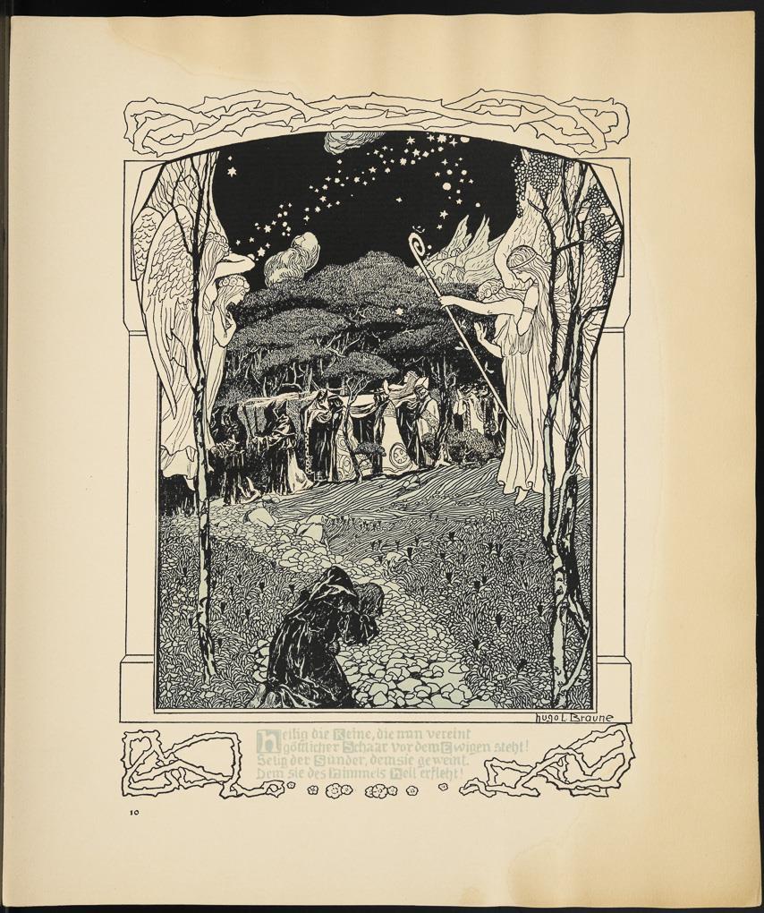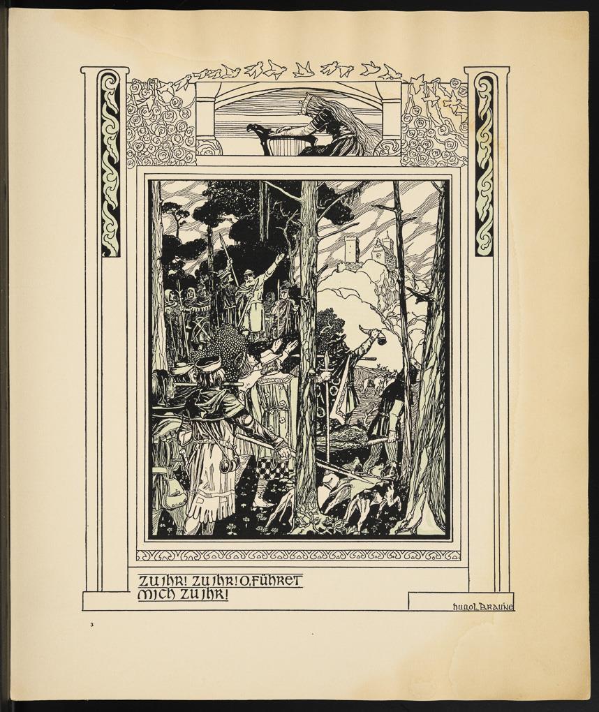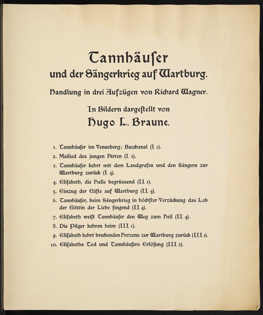 Vollständige Mappe mit 10 Illustrationen zu Richard Wagners "Tannhäuser und der Sängerkrieg auf der Wartburg" von Hugo Ludwig Braune; originaler Papp-Umschlag, Titelblatt mit Inhalt, verlegt von C.F.W. Siegels Musikalienhandlung R. Linnemann, Leipzig; aus der Reihe "Richard Wagner´s Bühnenwerke in Bildern dargestellt v. Hugo L. Braune". Blätter mit Wasserschaden, Umschlag geklebt, leicht griffspurig.