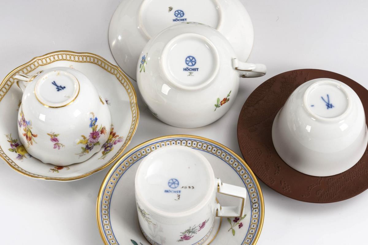 4 Tassen und 6 Untertassen Höchst mit Blumenmalerei sowie 1 weißes Koppchen mit Schwerterdekor in Unterglasurblau mit 1 Untertasse aus Böttger-Steinzeug.