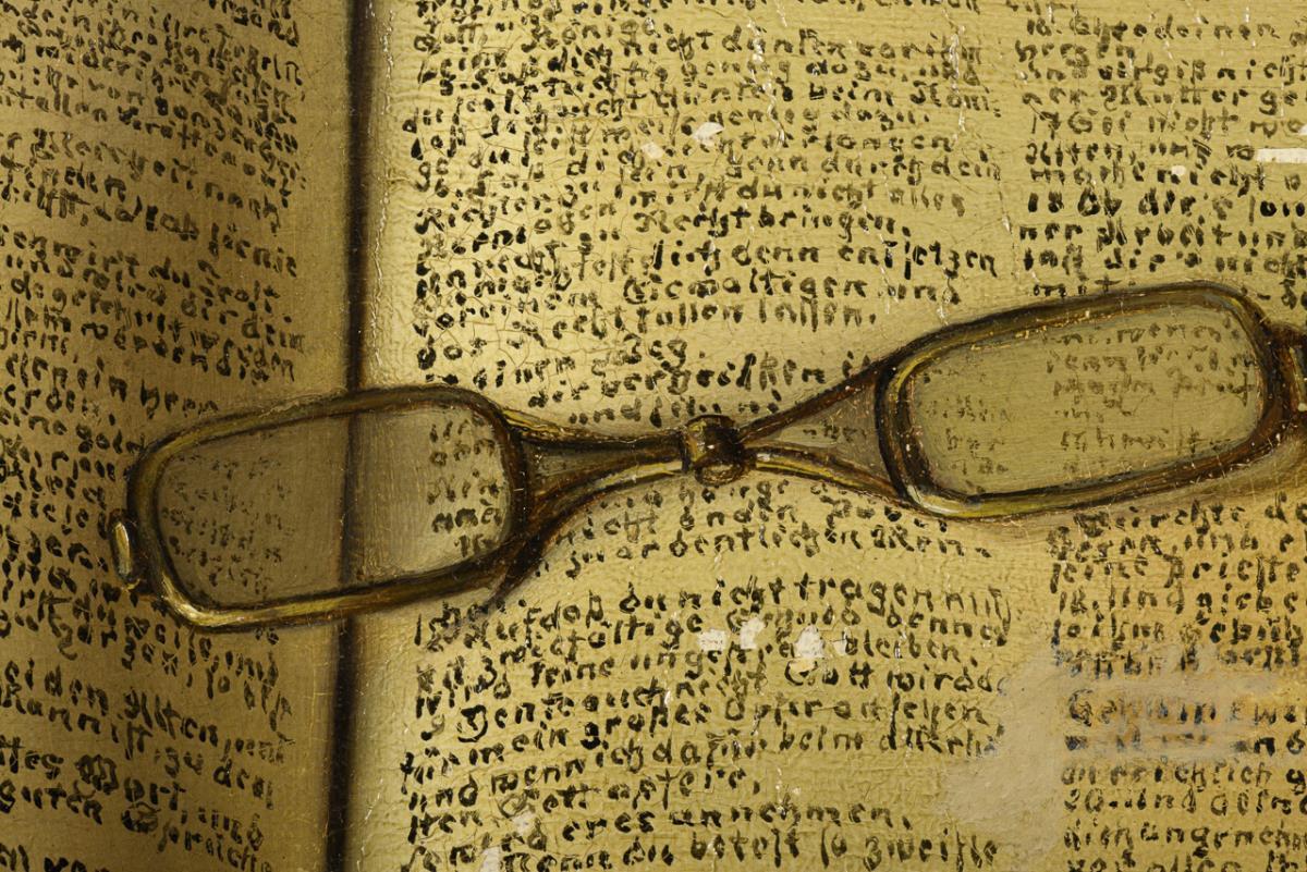 Aufgeschlagener Foliant mit Lesebrille vor weiteren Büchern und einem Strauß Rosen. Eine sehr kleine restaurierte Stelle mit Hinterklebung.
