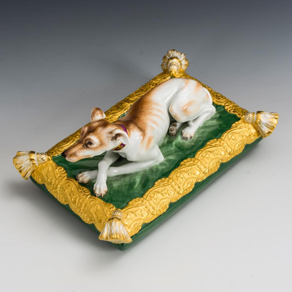 Prunkvolle Dose, der Deckel als Kissen gestaltet, auf dem ein Windhund liegt.