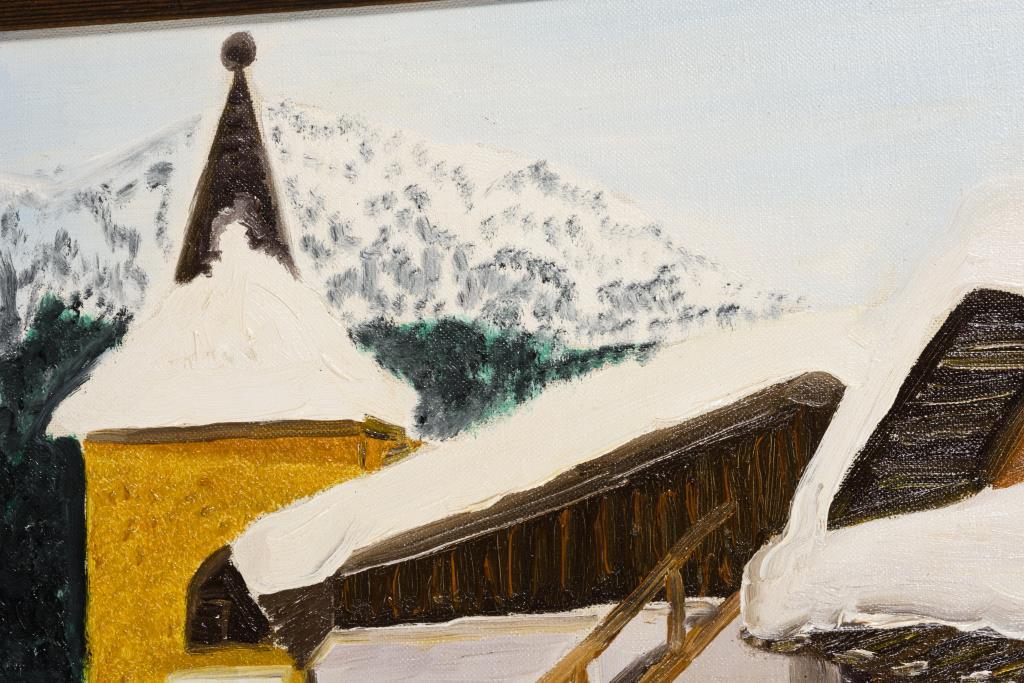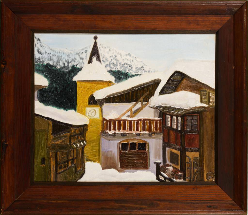 Naiv gemaltes Alpendorf im dichten Schnee.