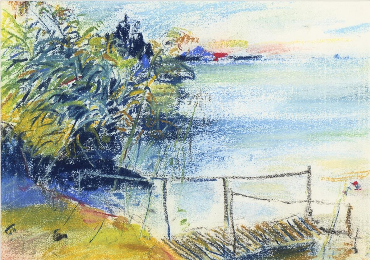 In expressiver Farbigkeit gemaltes Seeufer mit Steg.