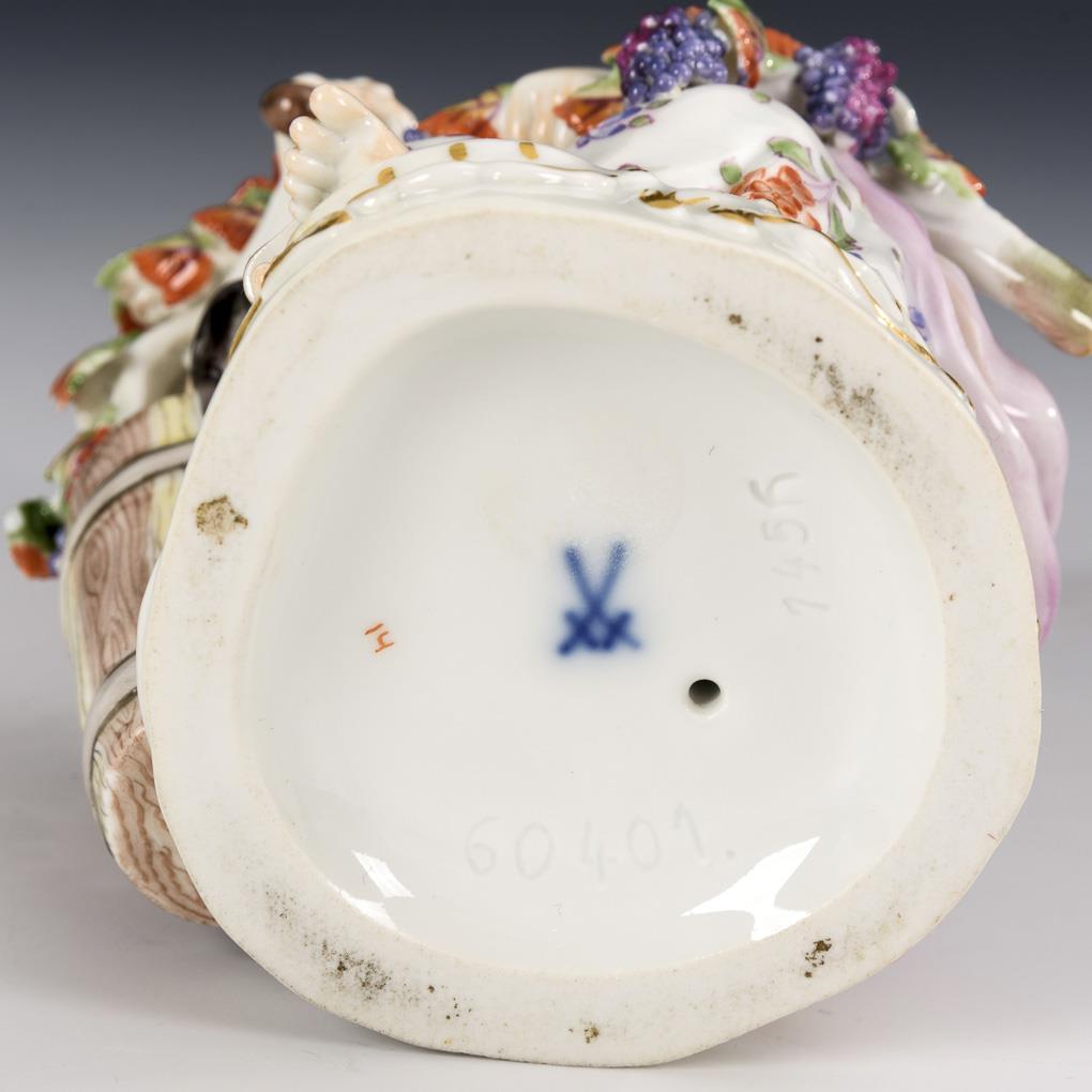 Auf einem Felssockel sitzendes Mädchen mit Weinrebe, Winzermesser und Kiepe. Trageband der Kiepe bestoßen.