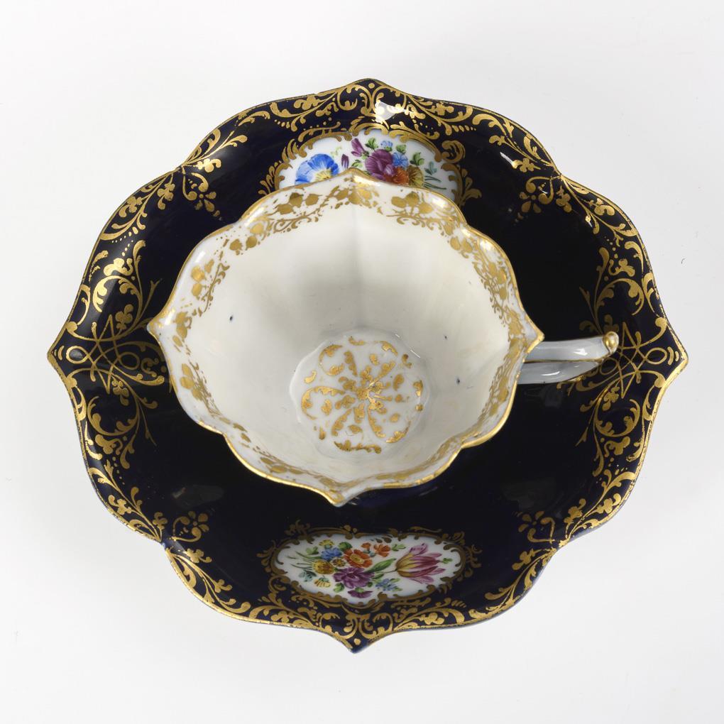 Kobaltblauer Fond, polychrome Malerei, Goldstaffage. H Tasse 5 cm, Ø originale Untertasse 14 cm.