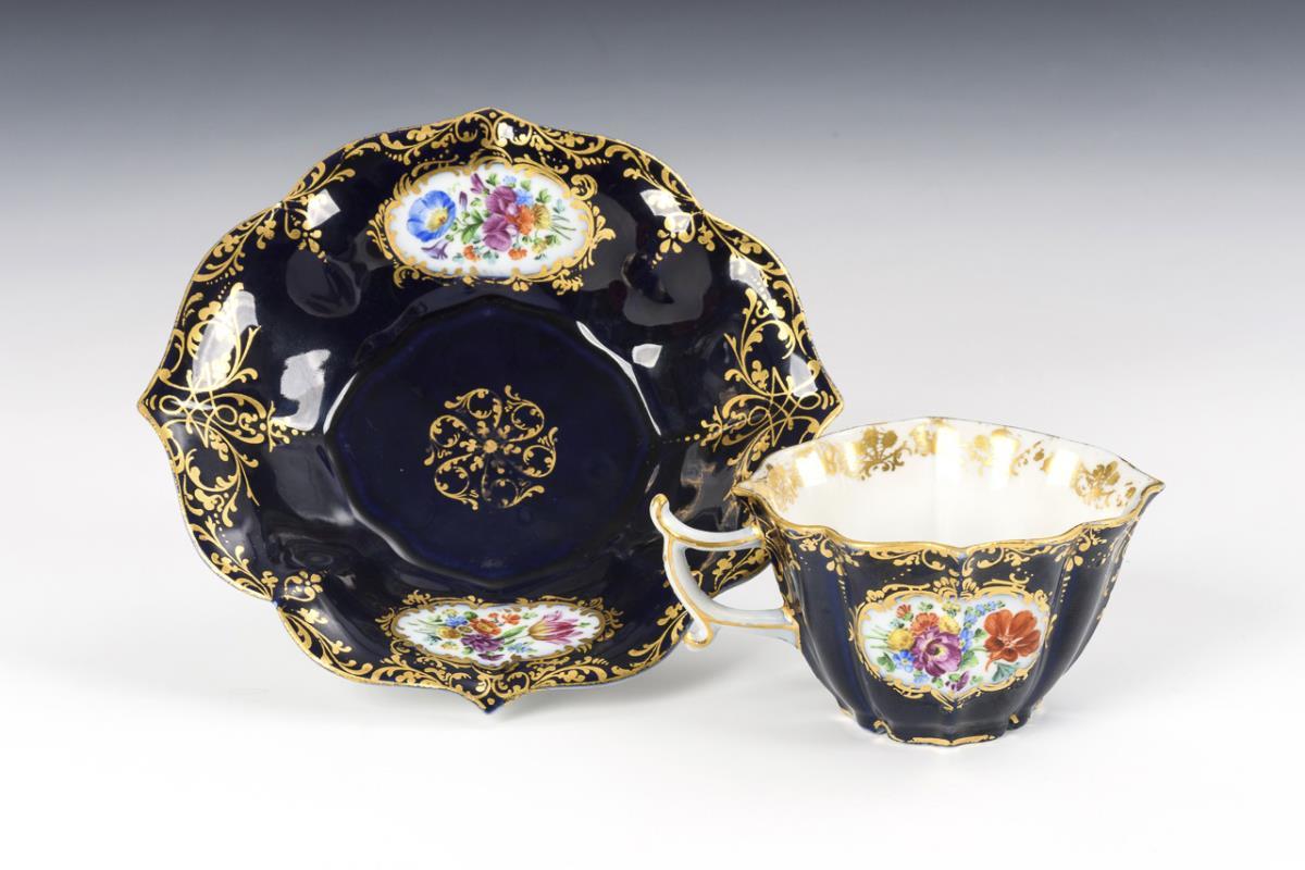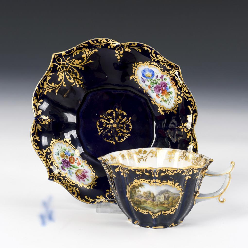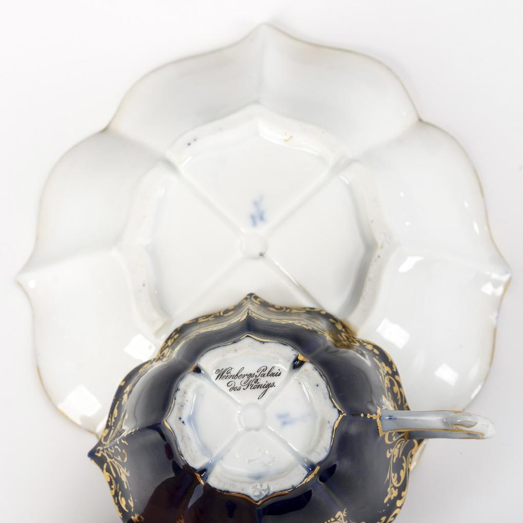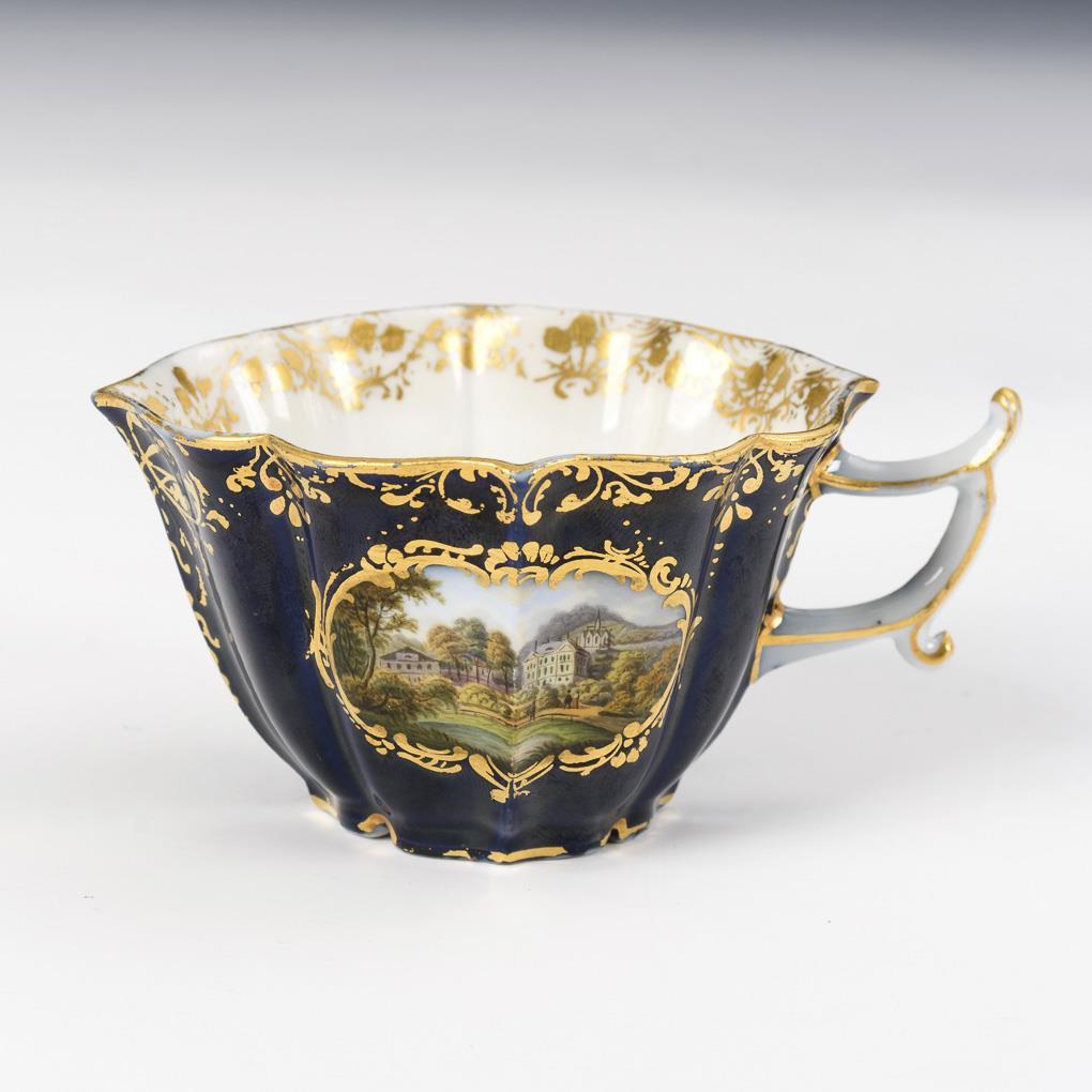 Vierpasstasse mit spitz geschweiftem Henkel. Kobaltblauer Fond mit ornamentaler Goldmalerei sowie Ovalkartuschen. In der schauseitigen Kartusche der Tasse die fein gemalte, unterseitig bezeichnete Ansicht der Villa und des Weinbergs des sächsischen Königs in Wachwitz bei Dresden. Minimaler Goldabrieb, 2 kleine Randbestoßungen an der Untertasse.
