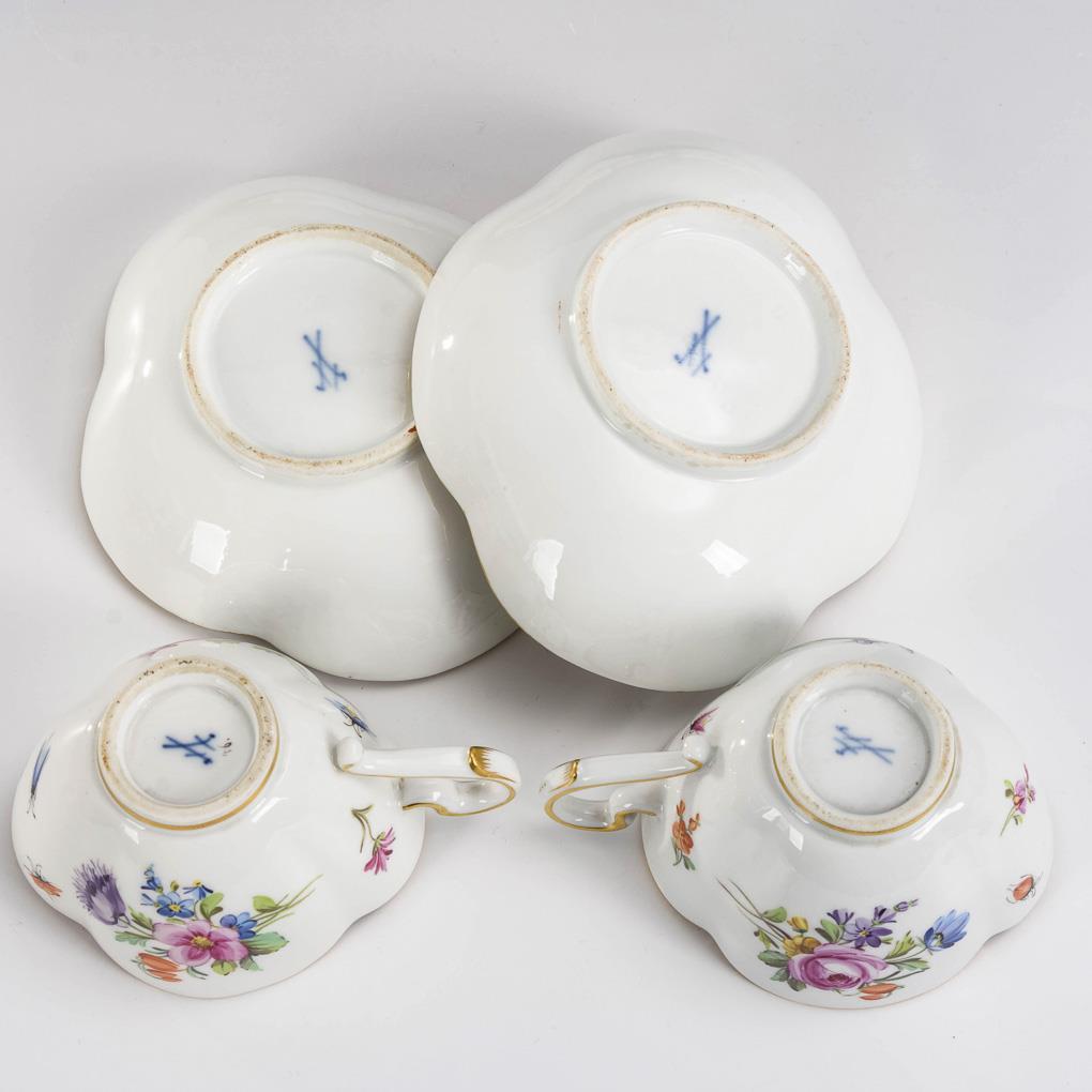 6 Vierpasstassen mit Blumen- und Insektenmalerei. Meissen.