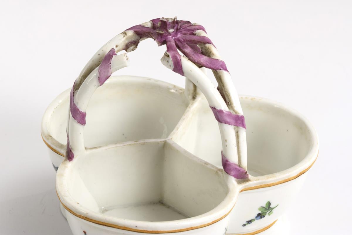 Dreipassige Menage mit schleifenumwundenem Henkel, Blumenmalerei. 1 Henkel defekt, Blüten bestoßen.
