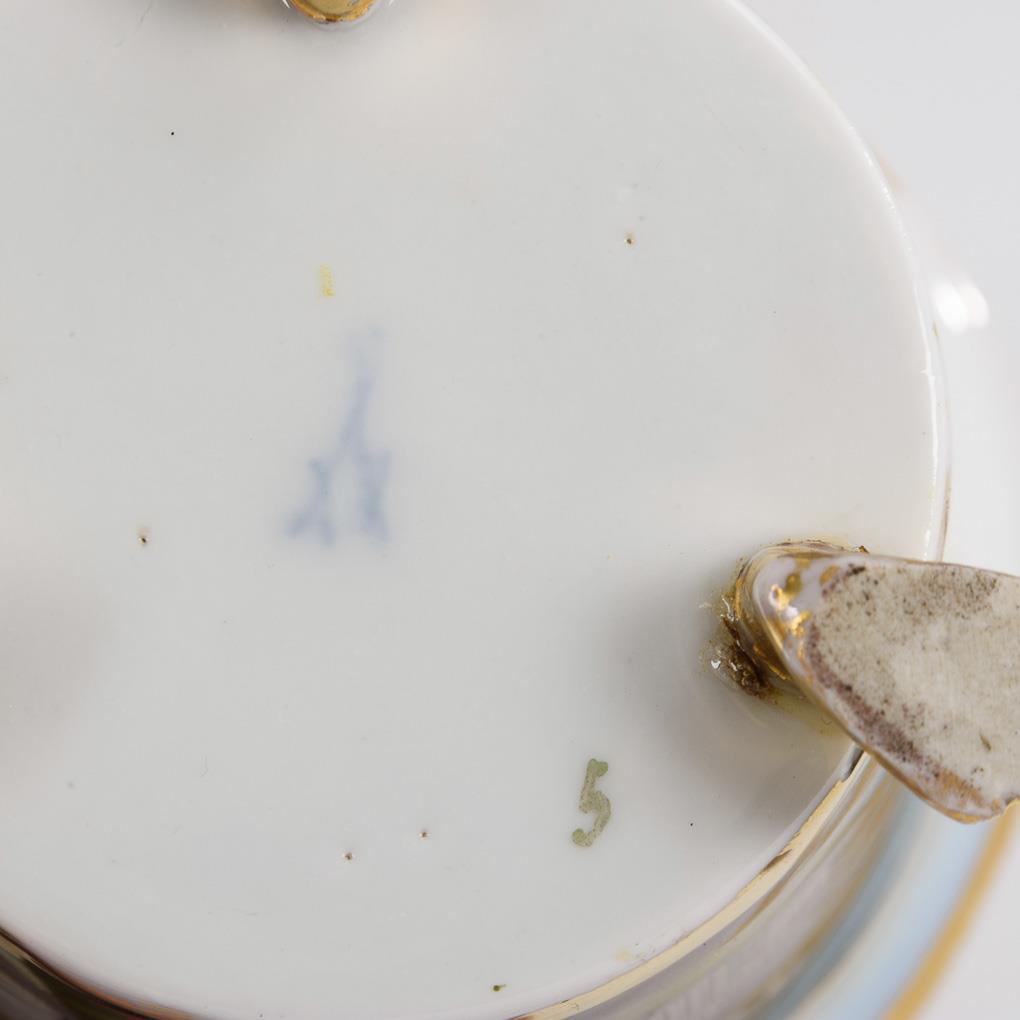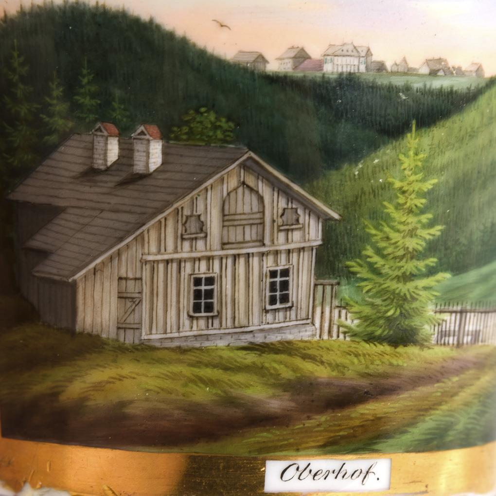Kratertasse mit drei Tatzenfüßen und hochgezogenem Henkel. Schauseitig eine goldgerahmte Rechteckkartusche mit einer bezeichneten Ansicht von Oberhof. Ohne Untertasse. Gold berieben, 1 Fuß geklebt, 1 retuschierter Randchip.