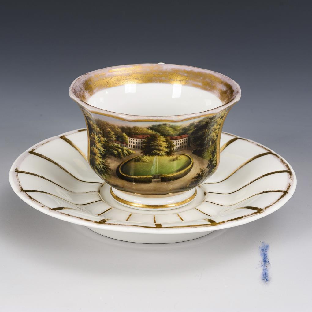 Polygonale, gefußte Glockentasse mit spitz geschweiftem Henkel. Schauseitig eine goldgerahmte Rechteckkartusche mit der Darstellung eines Parkes mit Schloss und mit Bassin und Fontäne. Gold berieben, Haarriss im Henkel, Tasse unterseitig restauriert.