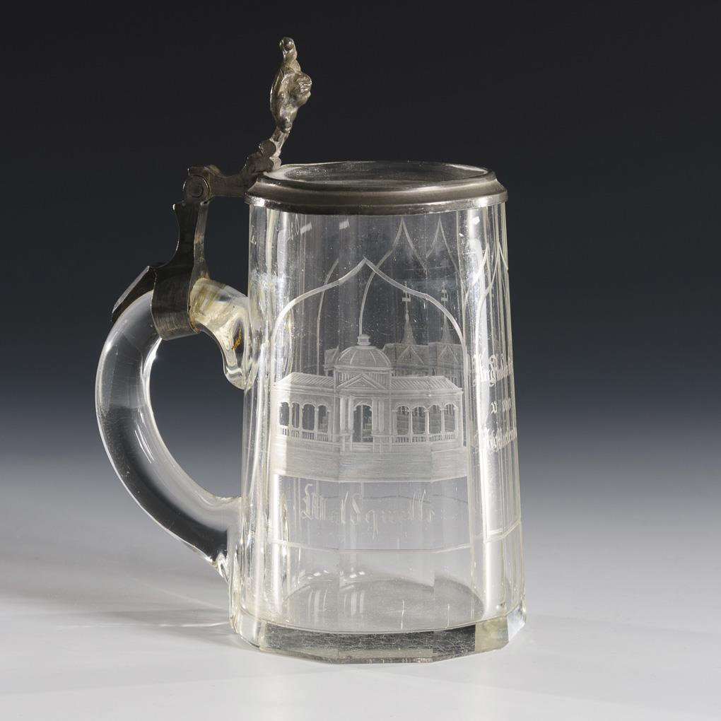 1x konischer, mehrfach facettierter Krug mit zinnmontiertem Scharnierdeckel und Ansichten von Marienbad. / 1x konischer, mehrfach facettierter Krug mit zinnmontiertem Scharnierdeckel und Ansichten von Karlsbad. / 1x facettierter Plattbecher mit Ansichten des Elbsandsteingebirges. 1x Chip am Stand und Bestoßung am Rand.