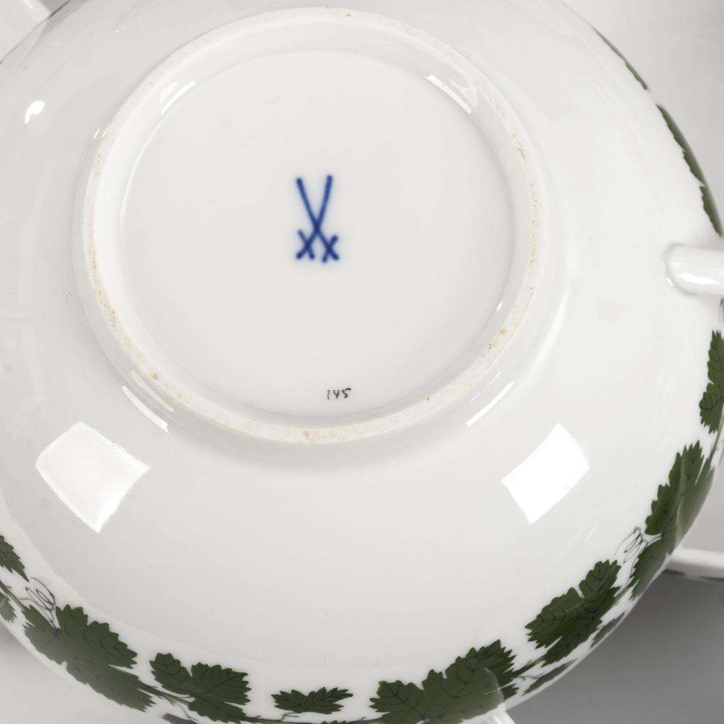 48 Teile. Form "Neuer Ausschnitt". 11 Speiseteller, 11 Suppentassen mit 11 Untertassen, 3 Ovalplatten (L 35, 36 und 41,5 cm), 3 Quadratschüsseln (2x 23 x 21,5 cm und 1x 26,5 x 27,5 cm), 2 Saucieren (L 22 cm), 1 ovale Deckelschüssel (L 28 cm), 1 kleine Terrine (Ø 22 cm), 2 Gewürzstreuer, 1 runde Schale (Ø 25,5 cm) und 1 Senftöpfchen mit Löffel. Chip am Deckelrand der Terrine, Rosenknauf des Senftöpfchendeckels bestoßen, Chip an 3 Untertassenrändern.