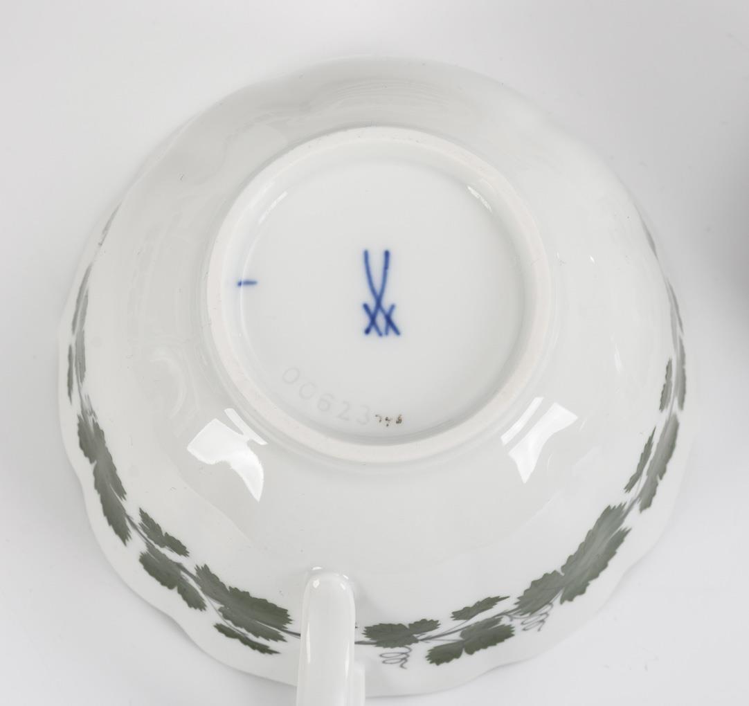 22 Teile. Form "Neuer Ausschnitt". Teekanne (H 12,5 cm), Milchkännchen, Zuckerdose, 5 Teetassen, 5 Untertassen, 5 Frühstücksteller, 1 Stövchen mit Brenner, 1 Durchbruchteller (Ø 28,5 cm) und 2 Kerzenleuchter. Minimale Bestoßung am Teekannenrand, Zuckerdosenknauf und 1 Tassenrand, 1 Tassenrand mit 2 Bestoßungen.