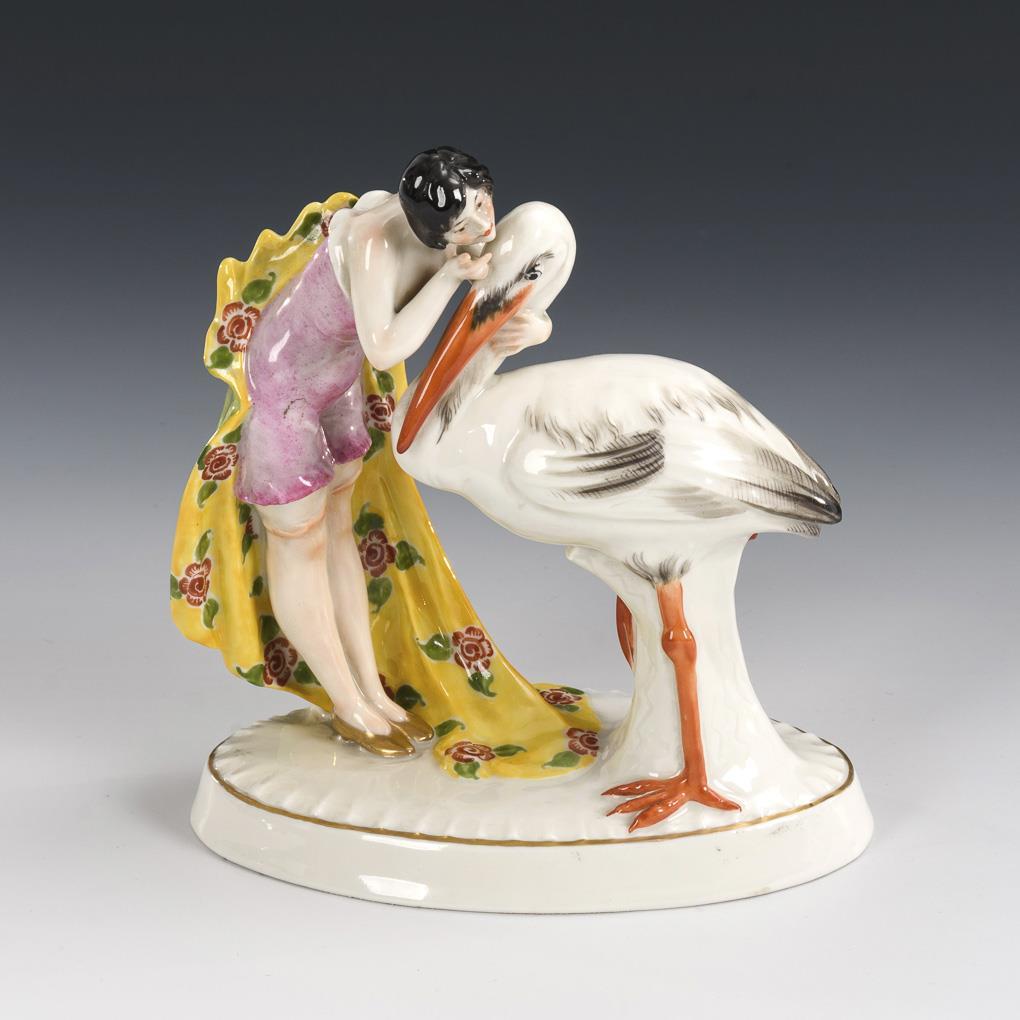 Einem Storch etwas in das "Ohr" flüsternde Dame.