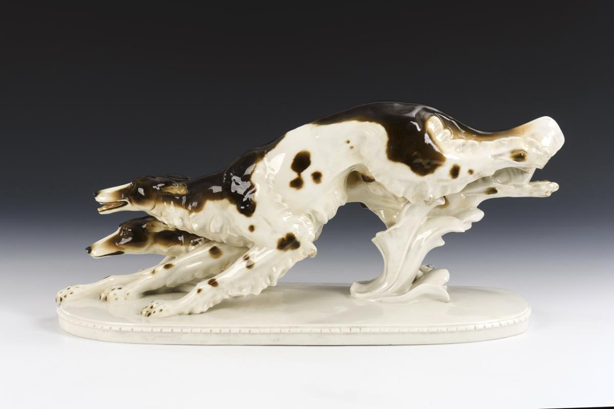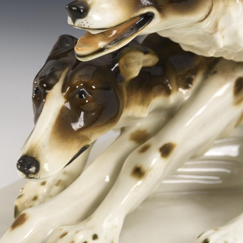 Über einen Ovalsockel jagendes Windhundpaar. 2 Hinterbeine fehlen.