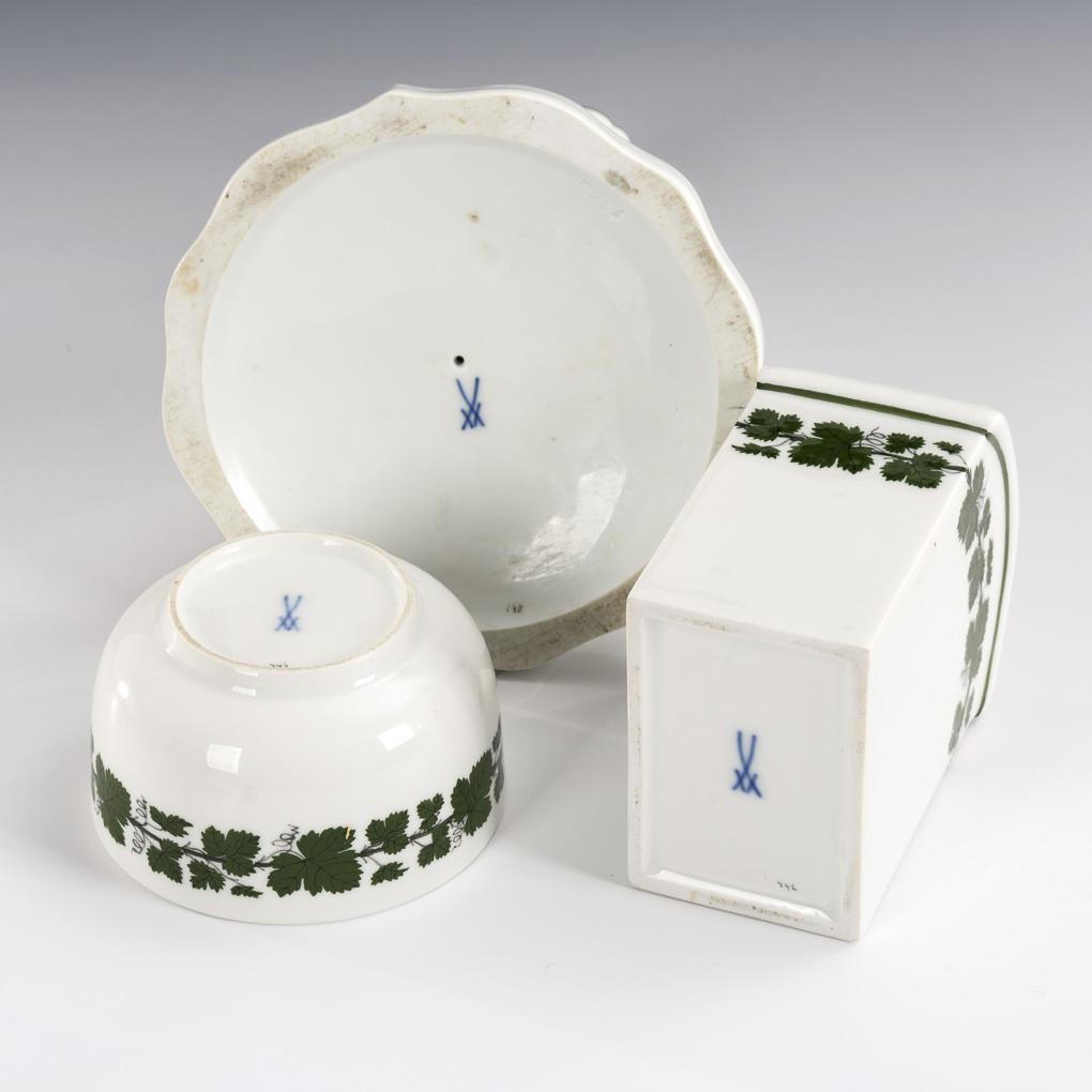 Teedose, Zuckerdose und 1 Leuchter mit Weinlaubdekor. Meissen.