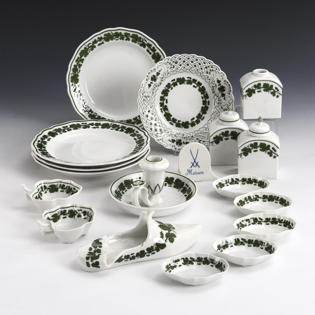 18 Teile mit Weinlaubdekor und 1 Aufsteller. Meissen.