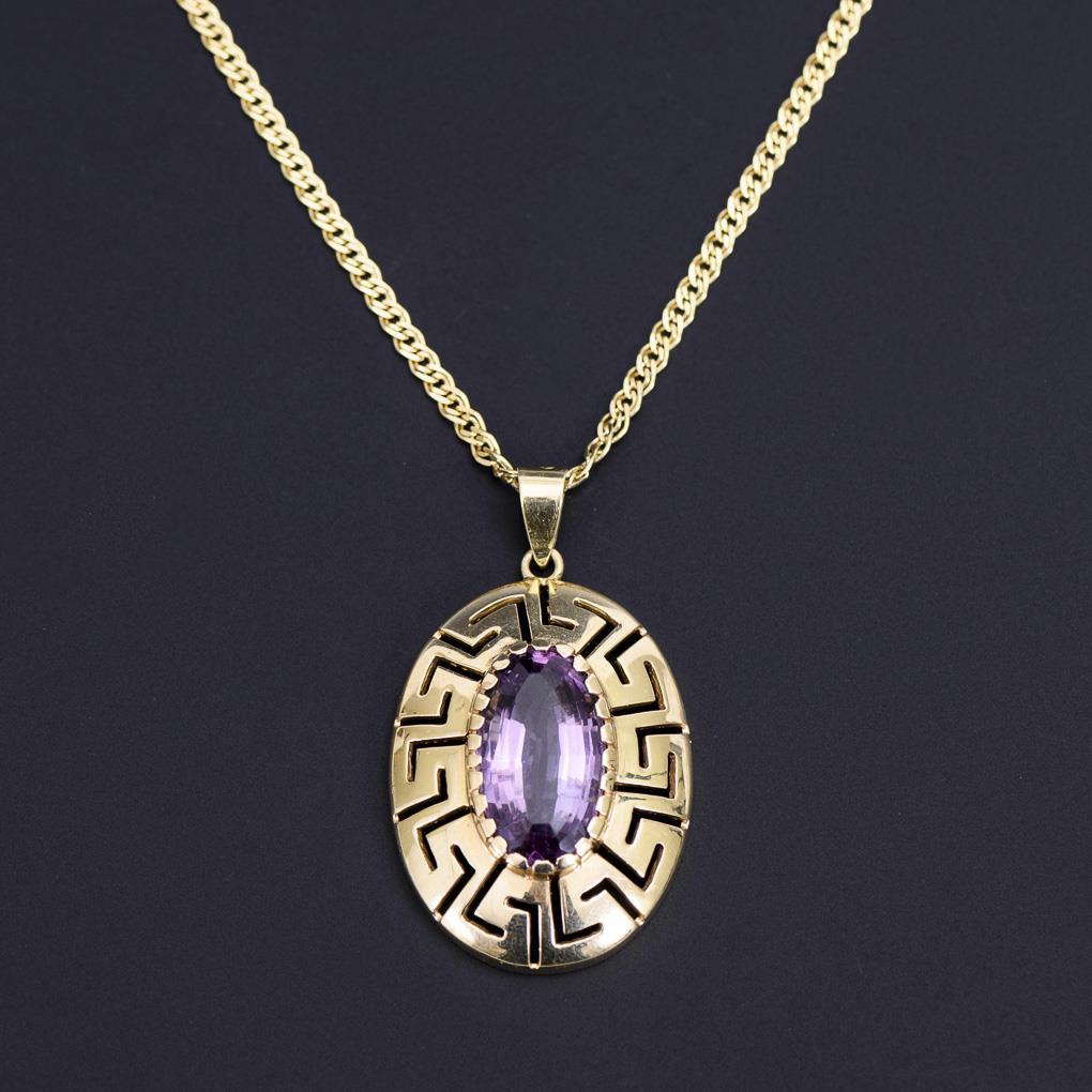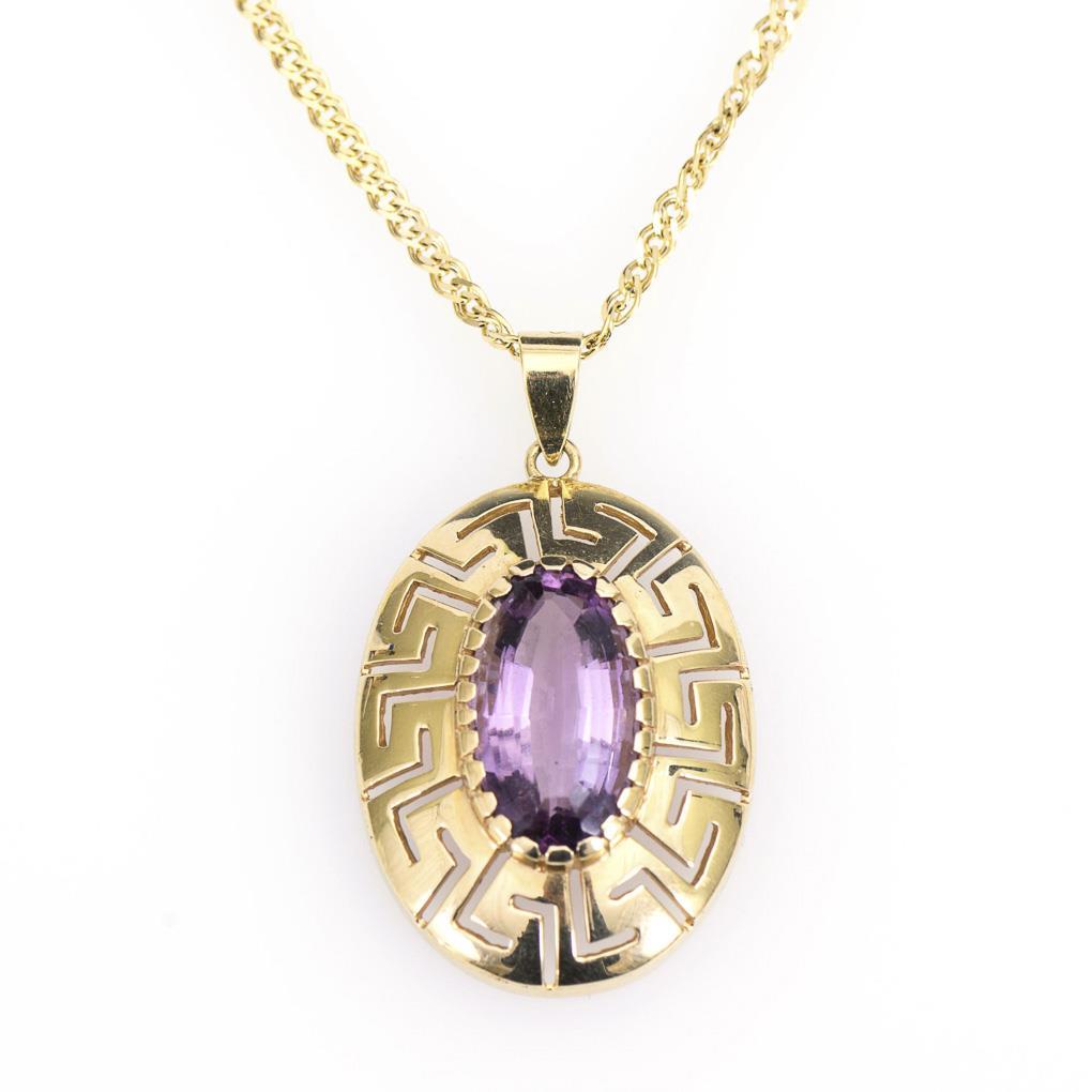 Gefasster Amethyst in mäanderverziertem Rahmen, an Doppelpanzerkette mit Ringfeder- und Karabinerschließe.