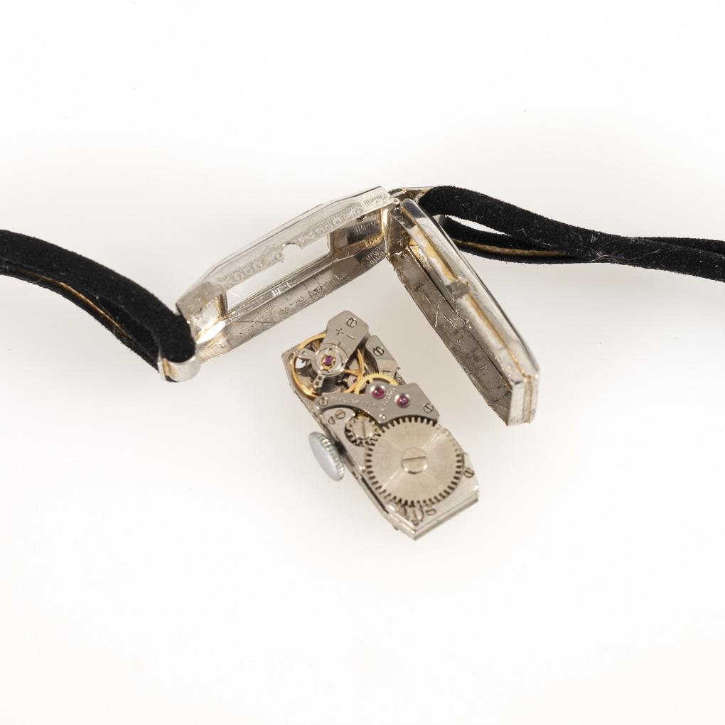 Rechteckiges Gehäuse mit 2 Brillanten und floral profiliertem Rand, an schwarzem Samtband mit Dornschließe. Alters- und Gebrauchsspuren.