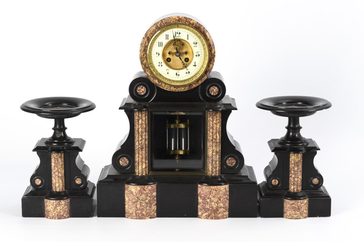 Schwarze Marmor-Kaminuhr mit 2 Beistellern.