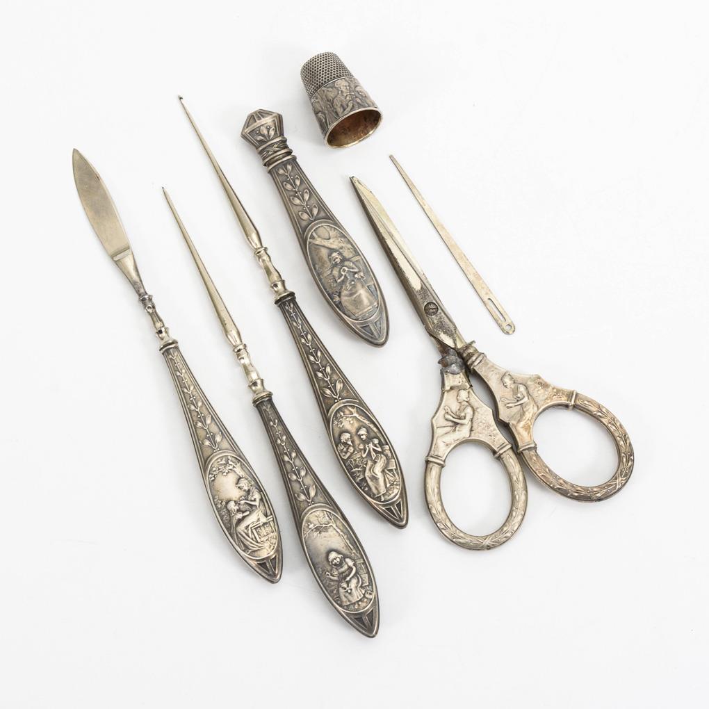 7-teiliges Set mit reliefierten Silbergriffen: Ahle, Häkelhaken, Fingerhut, Schere, Nadeletui, Messerchen, Einfädler. Schere defekt.