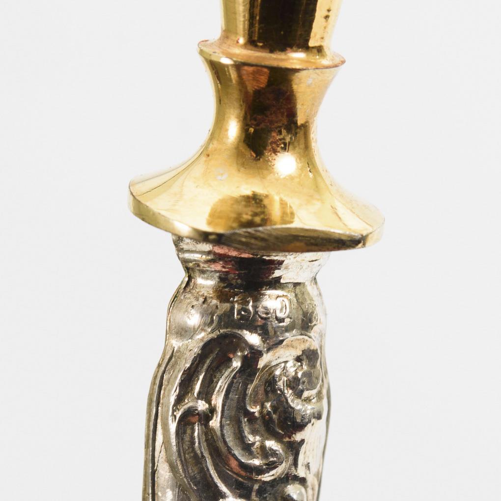 3 Vorlege-Messer und 3 Gabeln mit floral reliefierten, gefüllten Griffen. Im schwarzen Etui. 1 Messer geklebt (Klinge und Griff nicht in einer Linie).