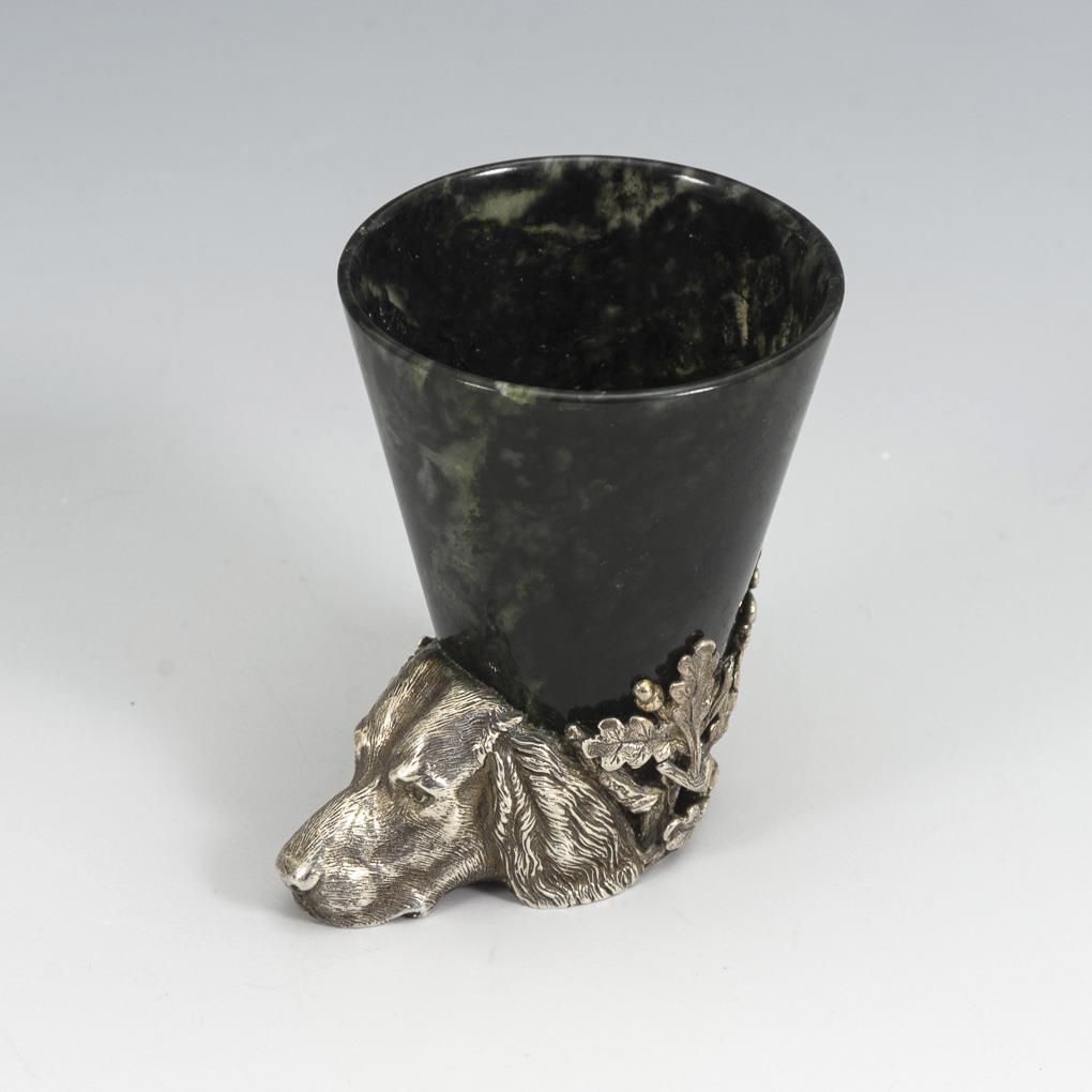 Konischer Becher aus Moosachat? mit silbernem Hundekopf als Fuß.