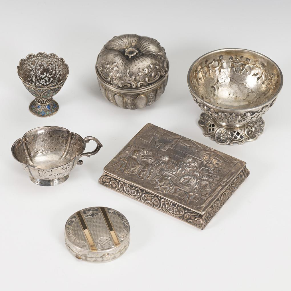Figürlich reliefiertes Zigarettenetui, runde Pillendose, Vierpasstässchen, Blütendose, Fußschälchen und kleiner Fußbecher mit Email. Gebrauchsspuren, Email mit Fehlstellen.