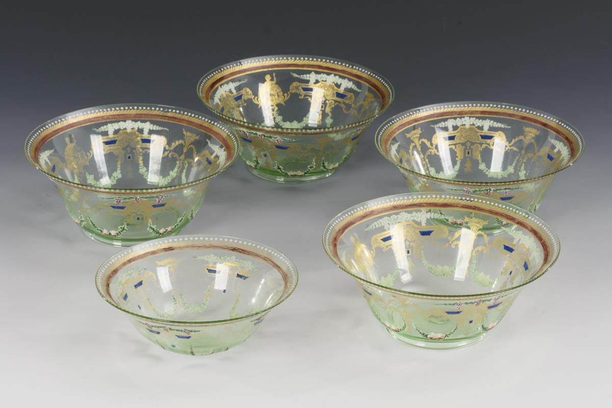 Farbloses und hellgrünes Glas, polychrome Emailmalerei, Goldstaffage; Abriss.